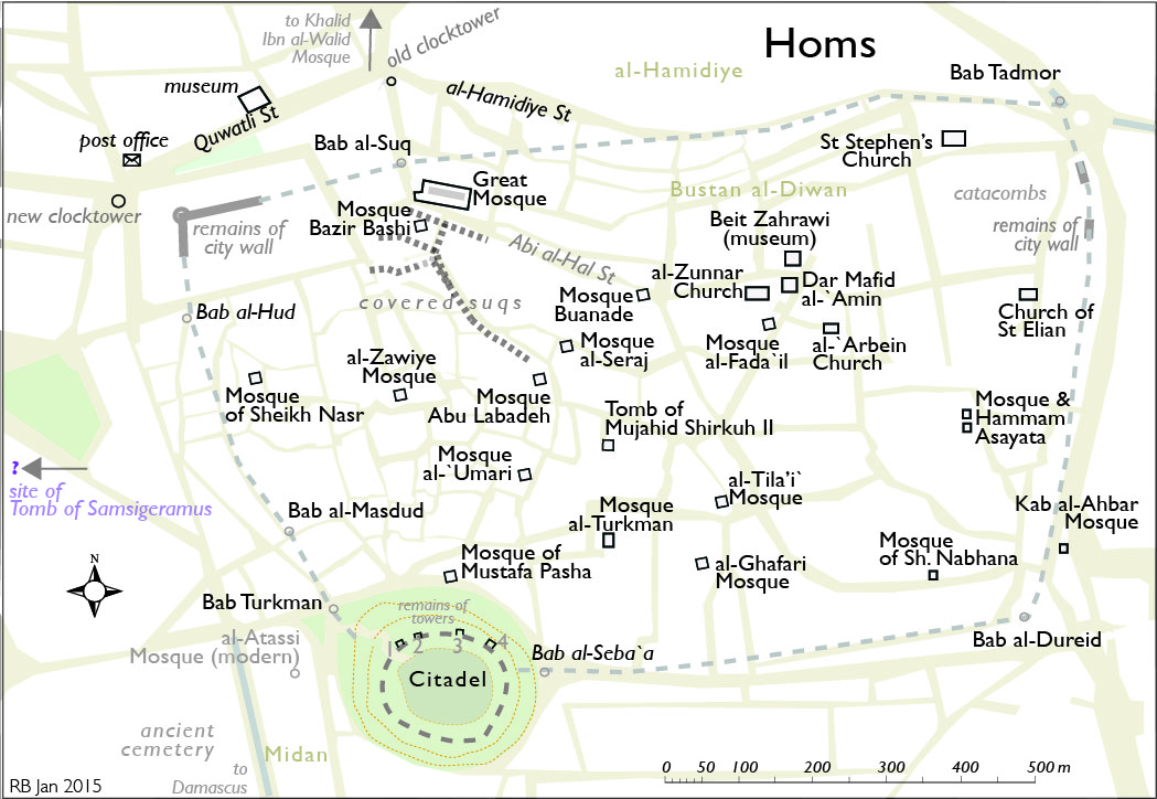 In the old city, once walled, a few remains survive including the Great Mosque, said to be the work of Nur al-Din, and Christian churches of considerable interest. Perhaps the city’s most important hidden gem is the series of wall-paintings in the martyrium of the Greek Orthodox Church of St Elian, restored after their re-discovery in 1969–70. They give us extraordinary insight into the medieval painting traditions of the Syrian churches.